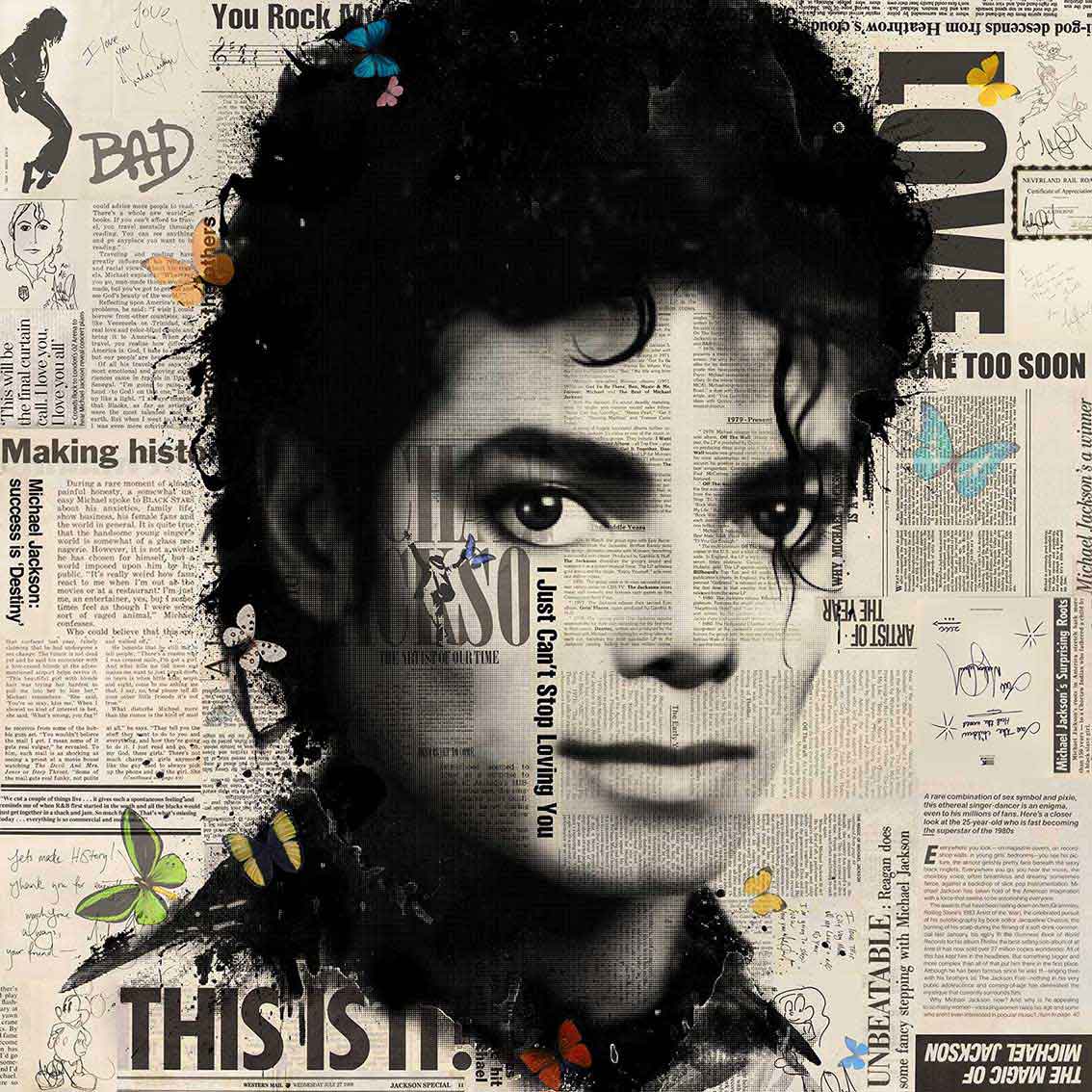 About this piece: Signed limited edition print featuring Michael Jackson’s portrait on a collage background of newspaper clippings about him.