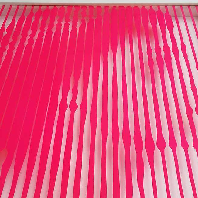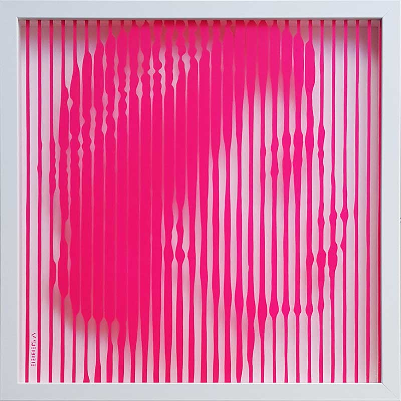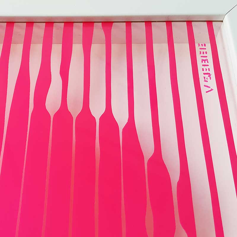 Painted on the reverse side of the glass using hand cut stencils and spray paint. the white areas are actually clear glass and the white background can be seen through it. the deep box frame gives the portrait a 3 dimensional feel and the illusion of floating in the air.