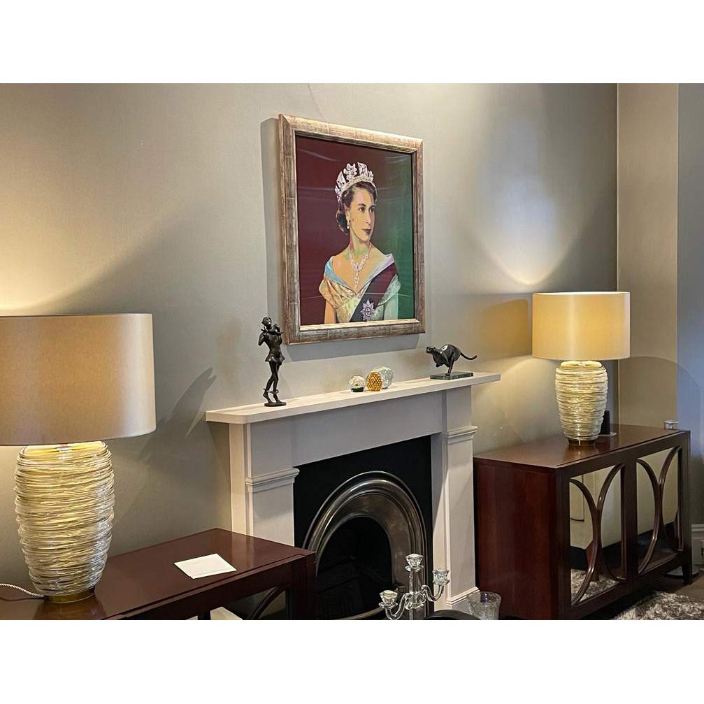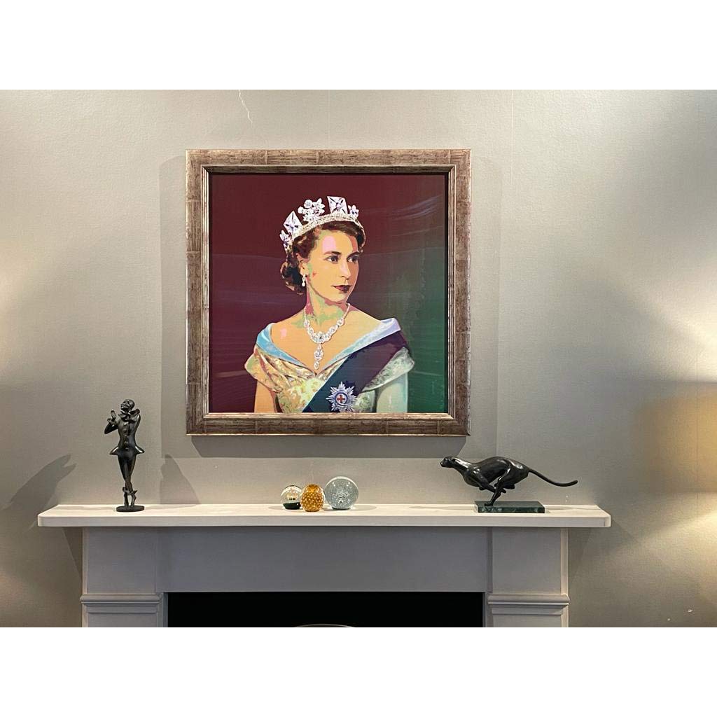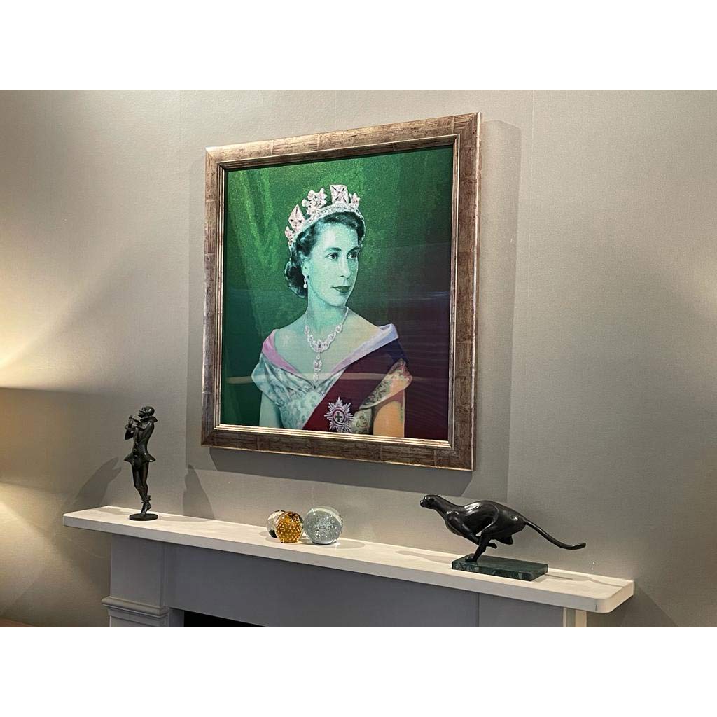 About this piece: This stunning portrait of The Queen changes colour as you move. This is one of our best selling pieces of HM and rightly so. Housed in an antique style brushed golden frame, juxtaposed with a modern lenticular finish makes this piece truly unforgettable!. The lenticular print by artist, Willy, changes it's appearance when viewed from different angles.