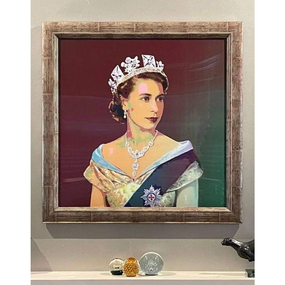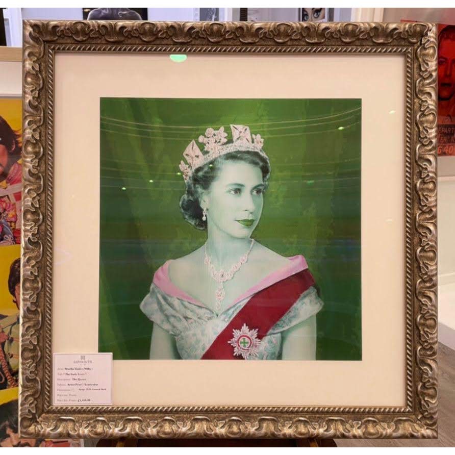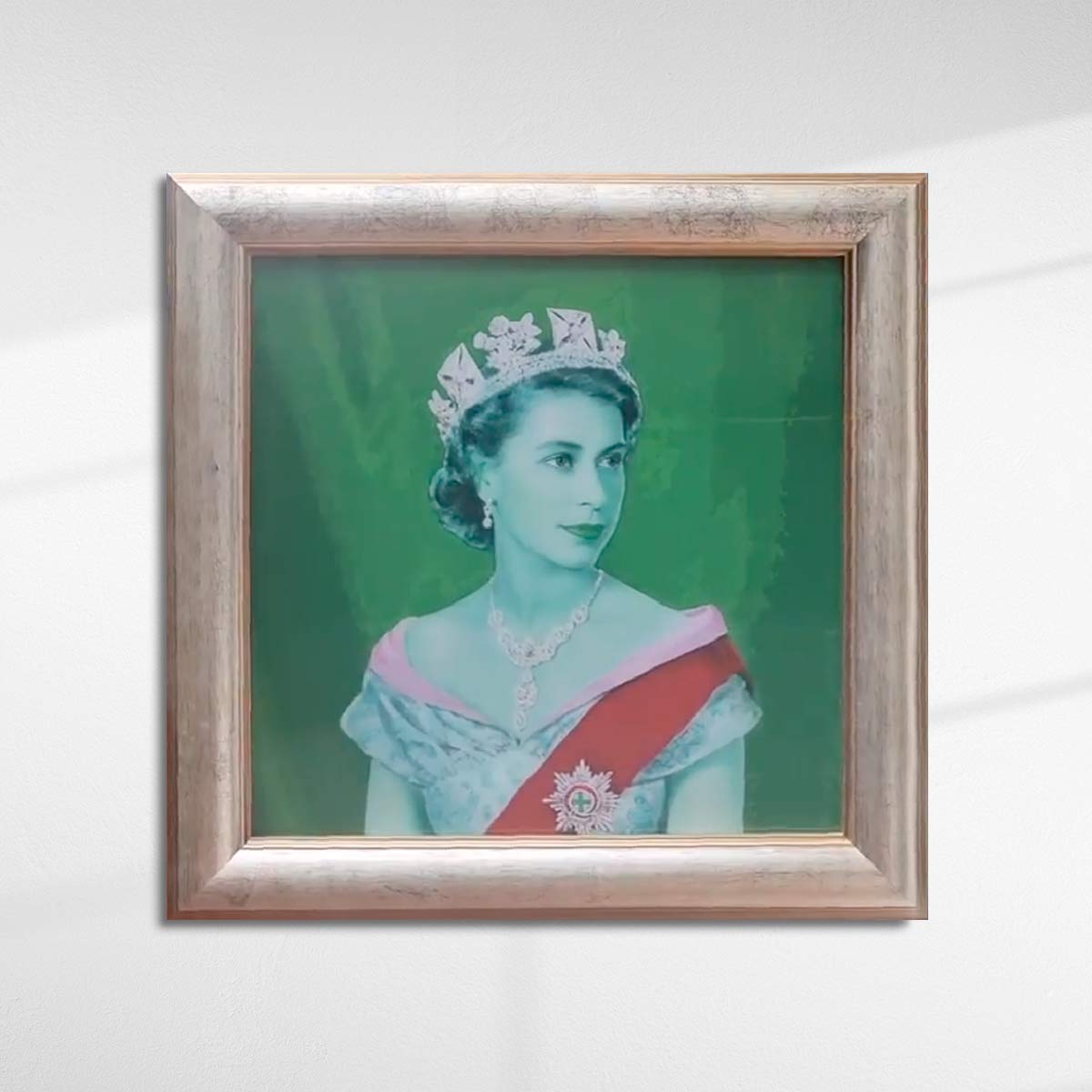 About this piece: This stunning portrait of The Queen changes colour as you move. This is one of our best selling pieces of HM and rightly so. Housed in an antique style brushed golden frame, juxtaposed with a modern lenticular finish makes this piece truly unforgettable!. The lenticular print by artist, Willy, changes it's appearance when viewed from different angles.