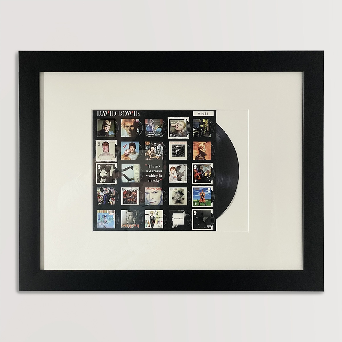 This Very Special Pack includes; six framed prints and 1st day Issue Special Bowie Post Marked Stamps, below each print, of David Bowie’s Hunky Dory, Aladdin Sane, Heroes, Lets dance, Earthling and Black Star albums. The Limited Edition pack also includes the Souvenir Album Fan Sheet with 6 Stamps and the Royal Mail Signed Ltd Edition Certificate for the souvenir pack.