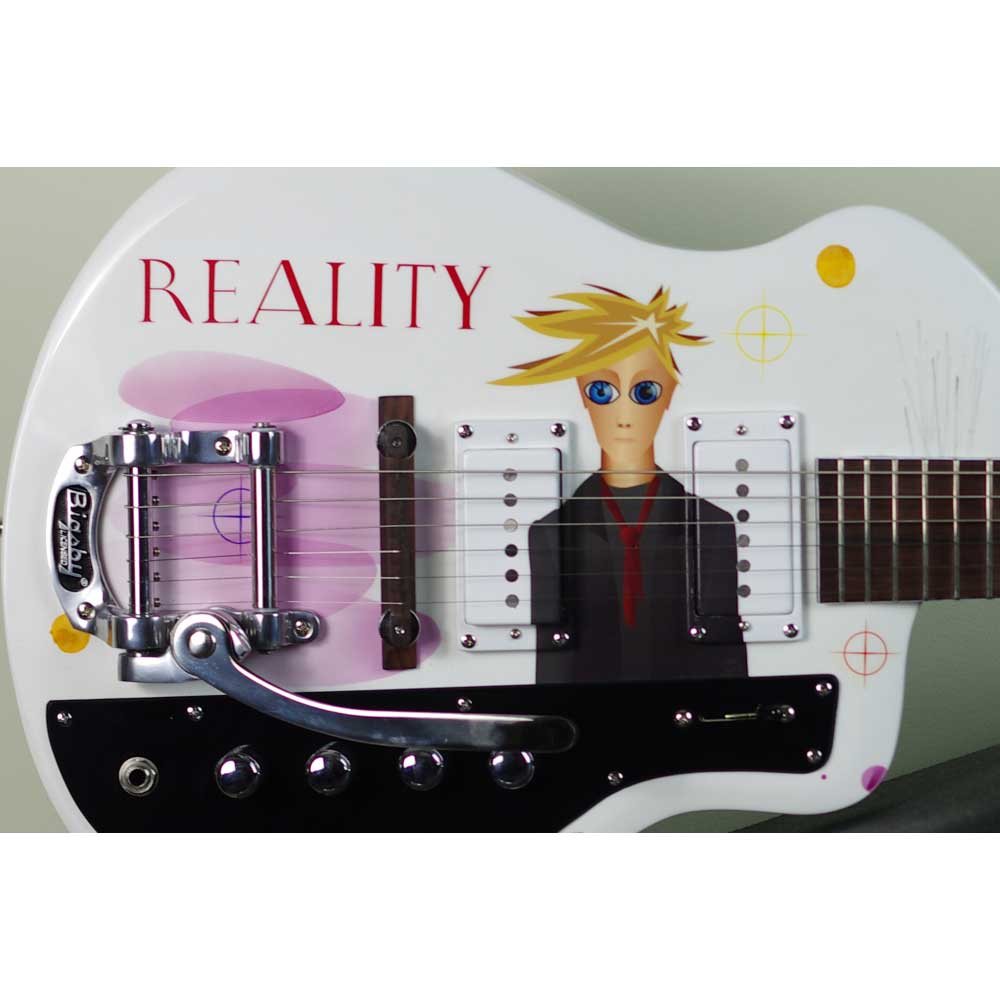 About this piece: Designed as a tribute to Bowie’s last tour, The Reality Tribute guitar has features that appeal to both Bowie fan and guitarist alike. The artwork is inspired by the Reality album cover, using digital and hard applied shapes, designs and other art marks that seek to reflect the eclectic and decade-spanning aspects of the music. The Bowie figure in the centre has been modified to represent the outfit that he wore on the tour – black jacket, black t-shirt and red neck tie.