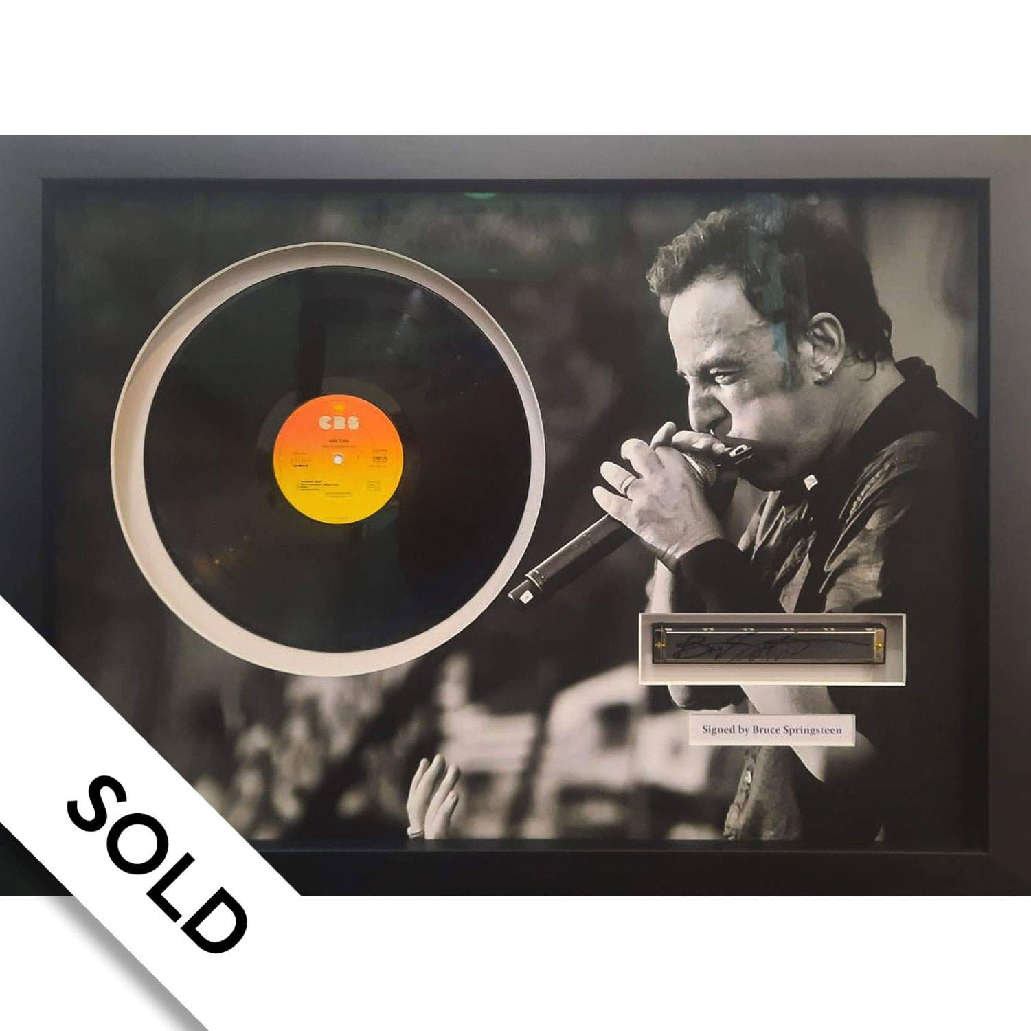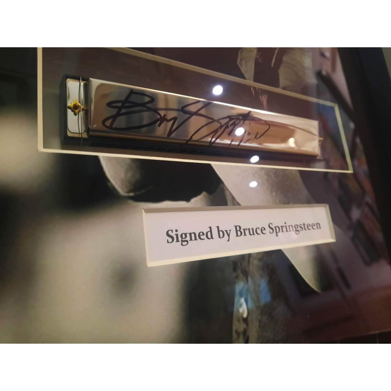 About this piece: Bruce Springsteen Signed Huntington Harmonica with Original Box. Set into a box frame with the Born to Run vinyl album and print of Bruce Springsteen playing harmonica behind it. Framed with AR70 (70% UV protection) artglass.