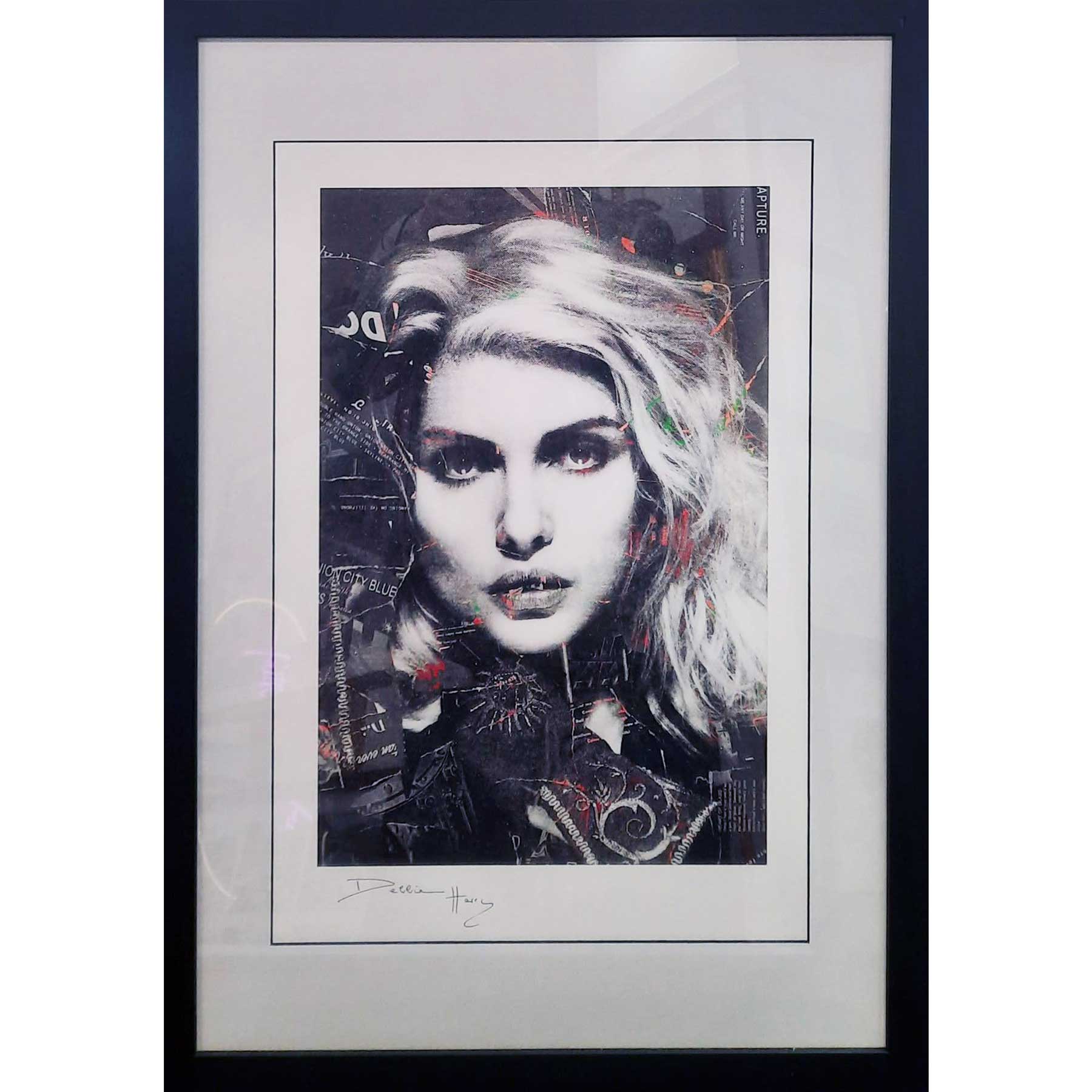 About this piece: Debbie Harry – Portrait with lyrics and song titles. Based on a photograph by Brian Aris. Giclee print on lustre fine art paper. Framed in black.